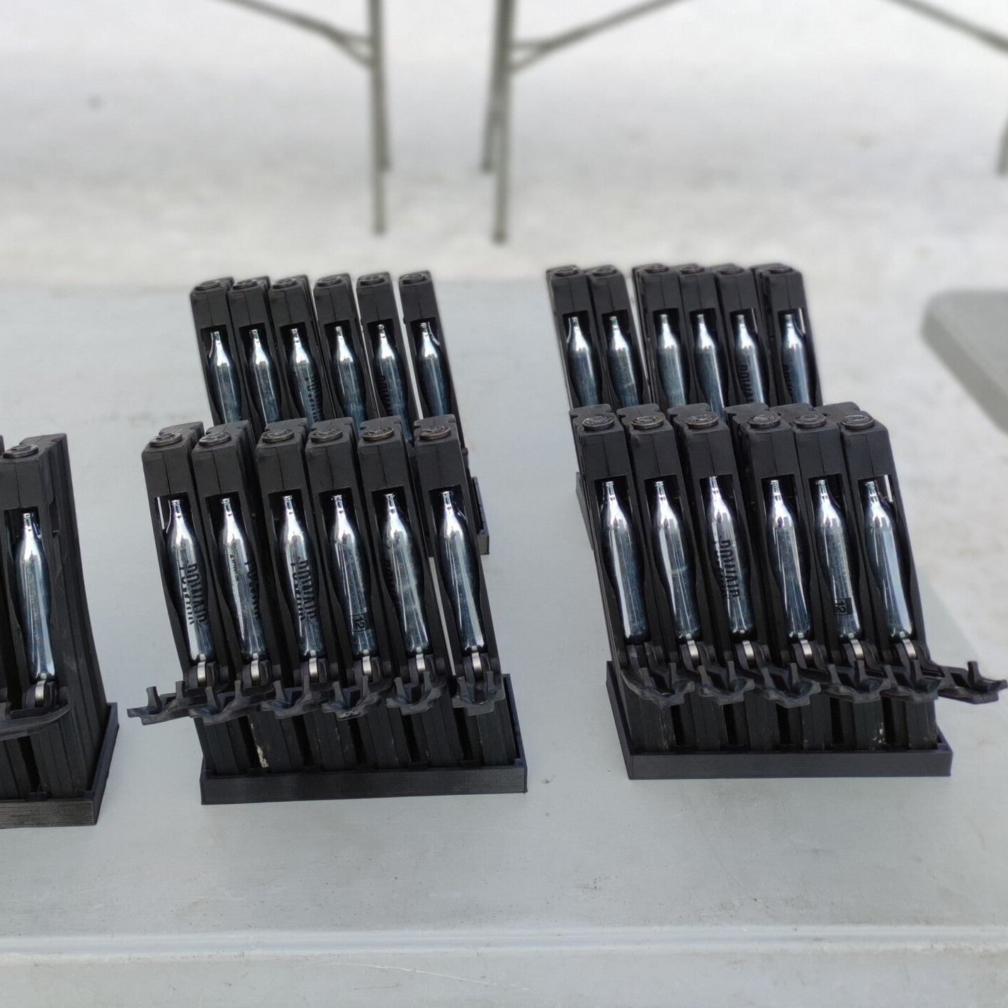 Élément important vous permettant de contrôler que les élèves ont bien acquis certains DRILL (gestuelle reflexe) de changements de chargeurs, nos répliques de magasins à munitions sont paramétrables et possèdent une carte électronique pour leur gestion de stock de "balles". Le fonctionnement du chargeur est le suivant : à l'ouverture du couvercle, un interrupteur est actionné et lors de la mise en place de la sparclette de gaz Co2 (8 ou 12Gr selon support) le chargeur sait qu'il vient d'être "alimenté" et autorise l'arme à fonctionner en mode "tir". A chaque action faite sur la détente, un décompte informatique est automatiquement géré par le chargeur. A la fin de stock, le chargeur neutralise l'arme jusqu'à ce qu'un autre magasin chargé soit introduit dans le puit de l'arme.