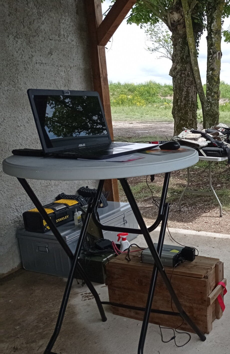 Elément aussi indispensable que le Pc portable lui-même, elle permet de créer son propre réseau de communication avec tous les éléments du simulateur. Non polluante pour les autres réseaux, sécurisée et indépendante elle met en oeuvre la synchronisation, les délais de lancement de sessions, les durées, les paramétrages de vies et d'armements. Elle permet aussi l'intéraction en temps réel des acteurs présents dans la session en permettant de stopper, de respawner ou de localiser des individus. Grâce à cet élément vous avez le visu permanent sur les tirs et sur le stock des munitions restantes dans les chargeurs de chaque arme. L'antenne est reliée au Pc via un câble USB, ce même câble pouvant servir à la recharge de l'ensemble des matériels présents dans le simulateur, puisque toutes les prises sont uniformisées.