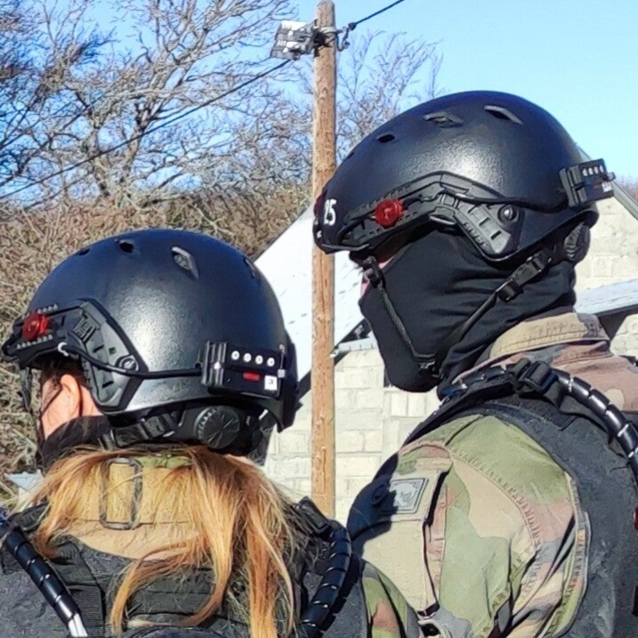 Le casque est un élément complémentaire pour évaluer correctement une action, il permet d'intégrer la tête dans la zone de tir ce qui techniquement est important à l'entrainement, il est équipé de 3 capteurs : 1 frontal + 2 latéraux, le tout relié à un boitier arrière incluant lui-aussi un capteur. Ce casque tactique est facile d'entretien, résistant et adaptable sur une tête nue via une sangle réglable et des mousses modulables. Ce matériel peut fonctionner sur un porte-plaque ou sur un gilet "civil-belligérant"